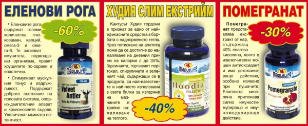 През този месец ви представяме уникалната със своята чиста и девствена природа страна и най-добрите натурални продукти на фирма НУТРАЛаб, които идват оттам. Тях можете да намерите във всички магазини „Лечител“ със супер промоционални намаления през ноември. Така например продуктите Еленови рога, Худия слим екстрийм и Помегранат ще се предлагат със следните отстъпки през целия месец: