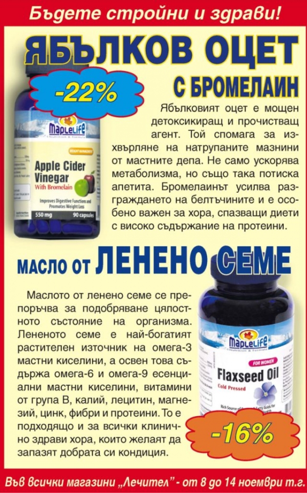 През втората седмица (от 8 до 14 ноември) Ябълков оцет с бромелаин ще бъде с 22% намаление, а Маслото от ленено семе – с 16%.